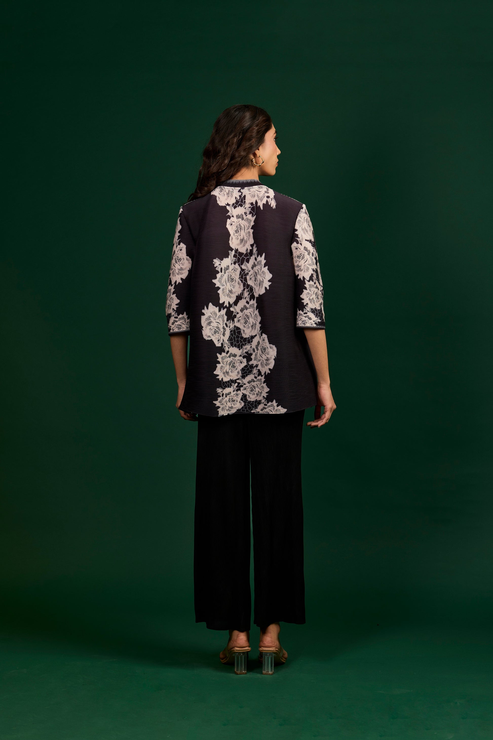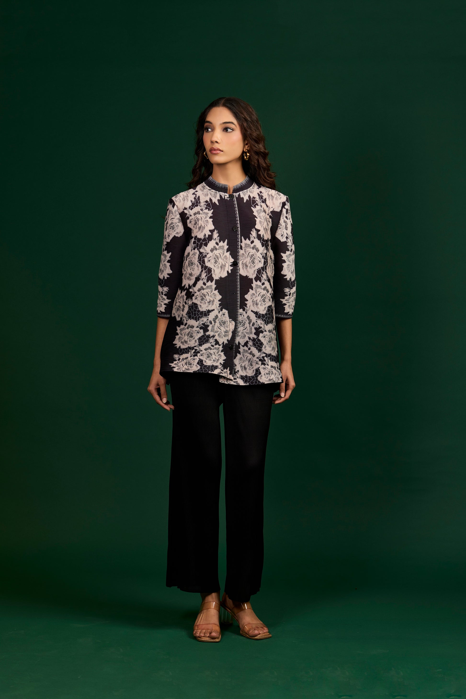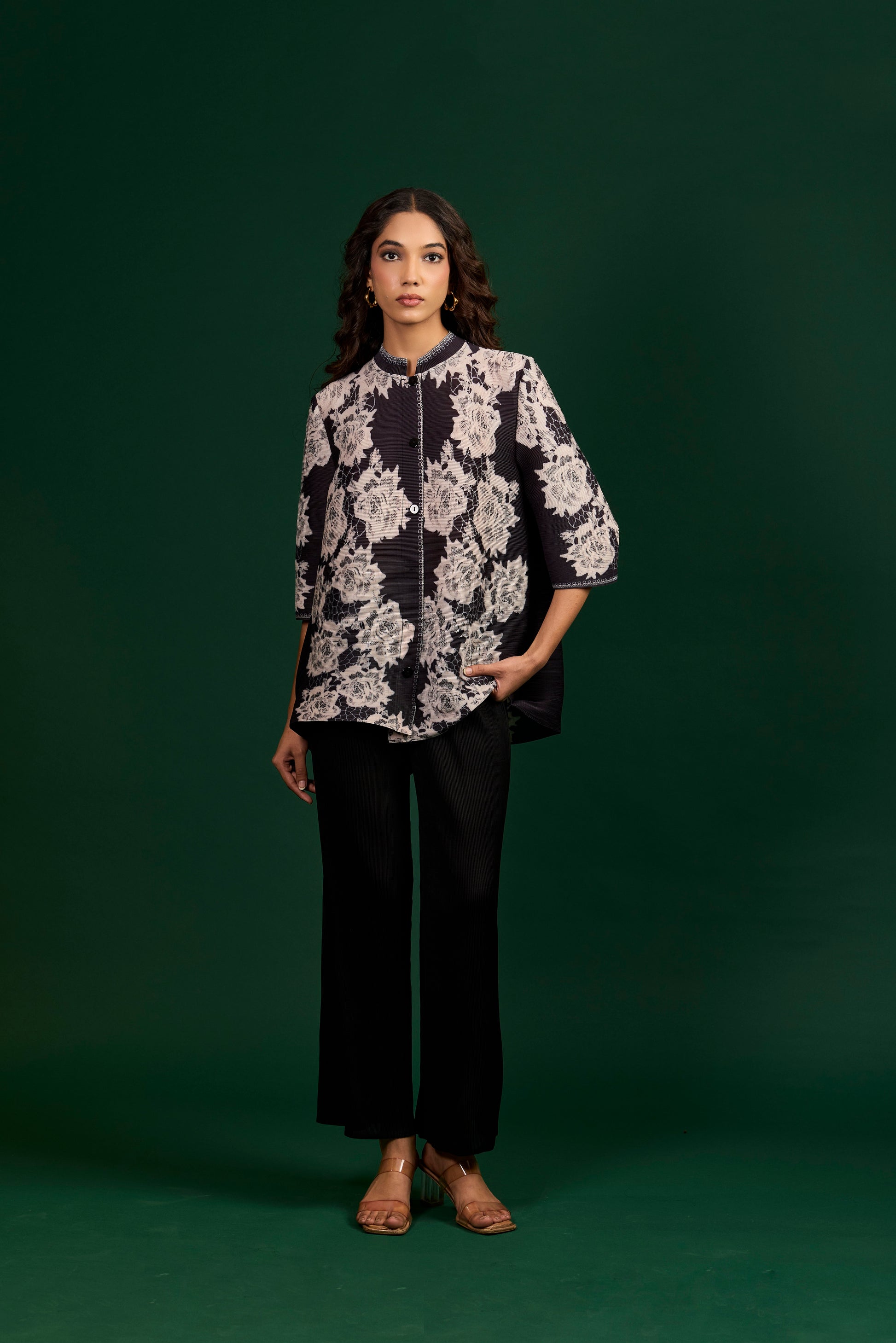 Make a bold statement with this black button-down shirt adorned with contrasting ivory floral patterns, complemented by sharp black trousers for a refined and confident ensemble.(Fits from S to XXL)