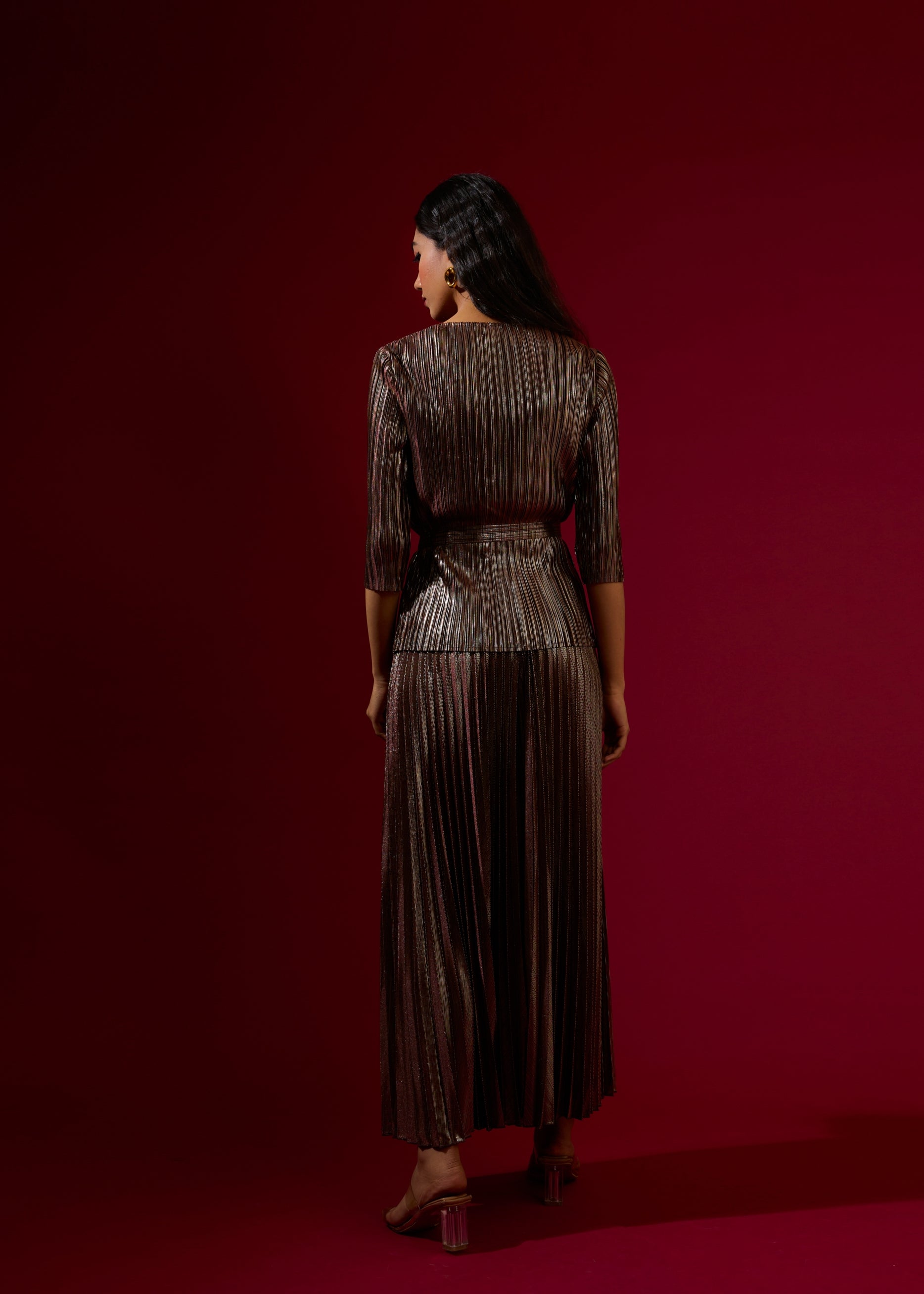 An elegant pleated co-ord set which is perfect for evening soirees. Style this chic set with gold accessories & a metallic clutch for an effortlessly stylish look. (Fits from S to XXL)
