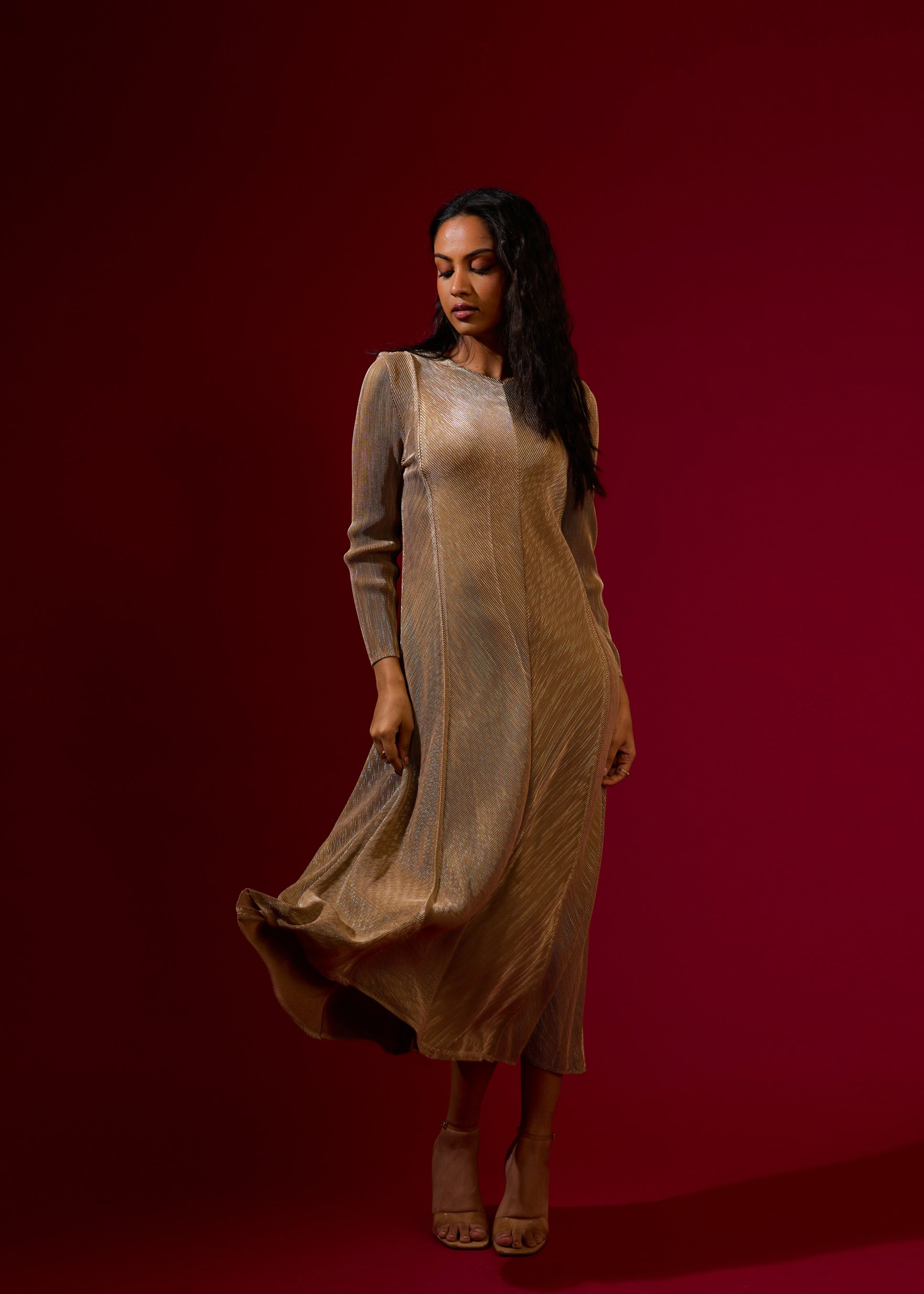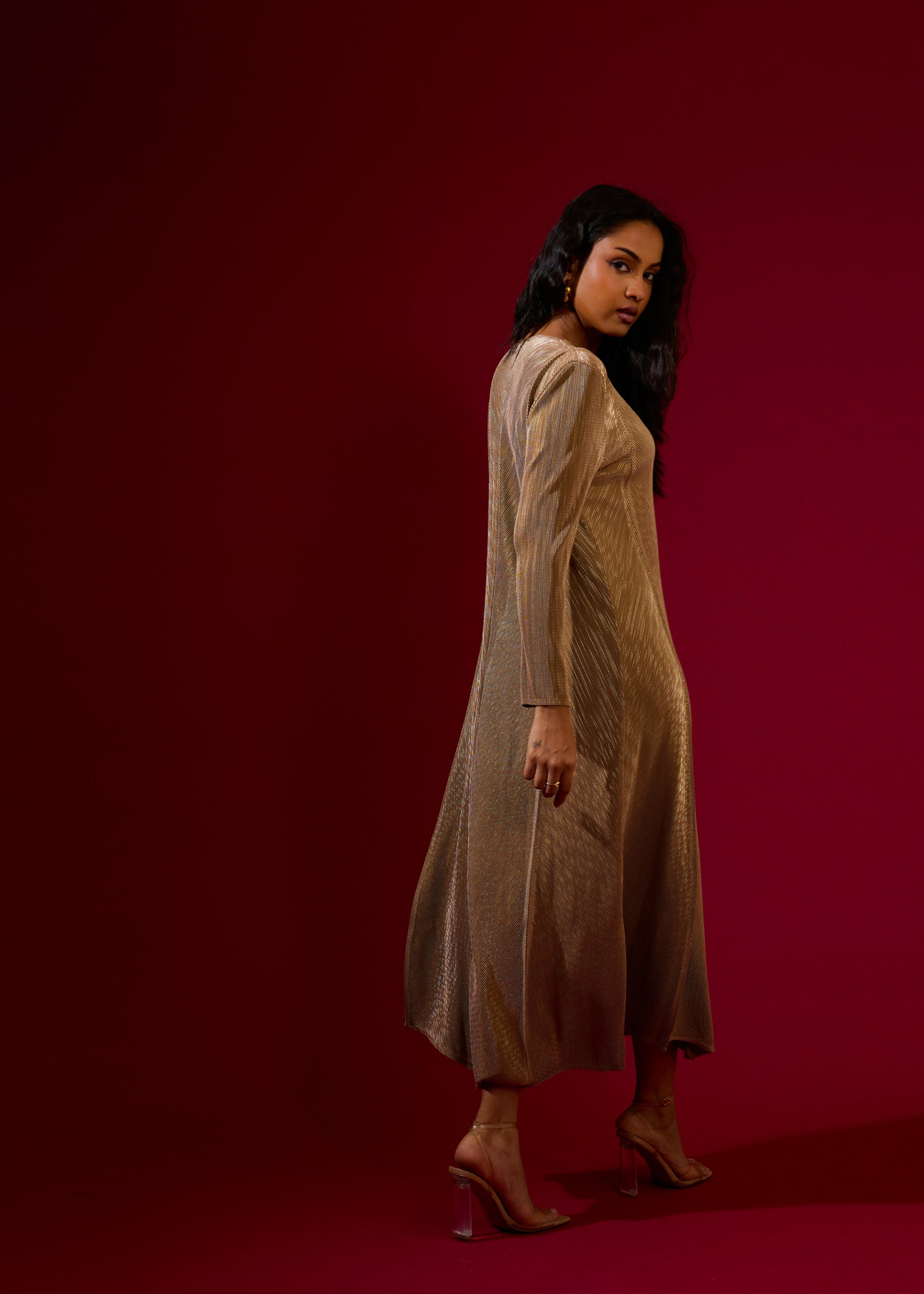 Get ready to slay the party in our Metallic Finish Gold A-Line Princess Cut Long Dress! The slimming silhouette accentuates the waist at just the right place. Its sleek design makes it a must-have for anyone's wardrobe. (Fits from S to XXL)