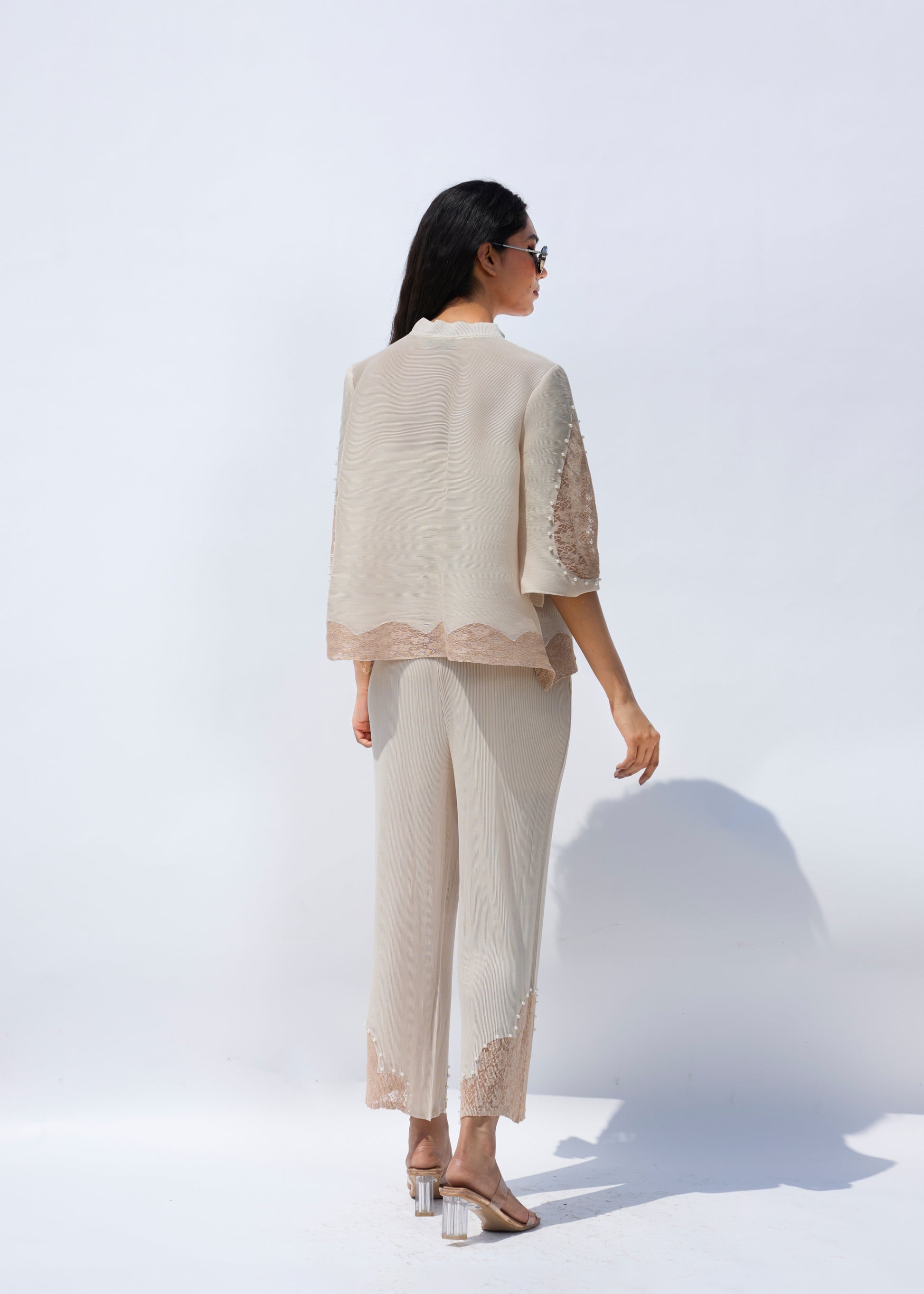 This beautiful combo of pleated shirt and pants combo featuring delicate lace and pearls. A perfect combination of elegance and edge. (Fits from S to XXL)