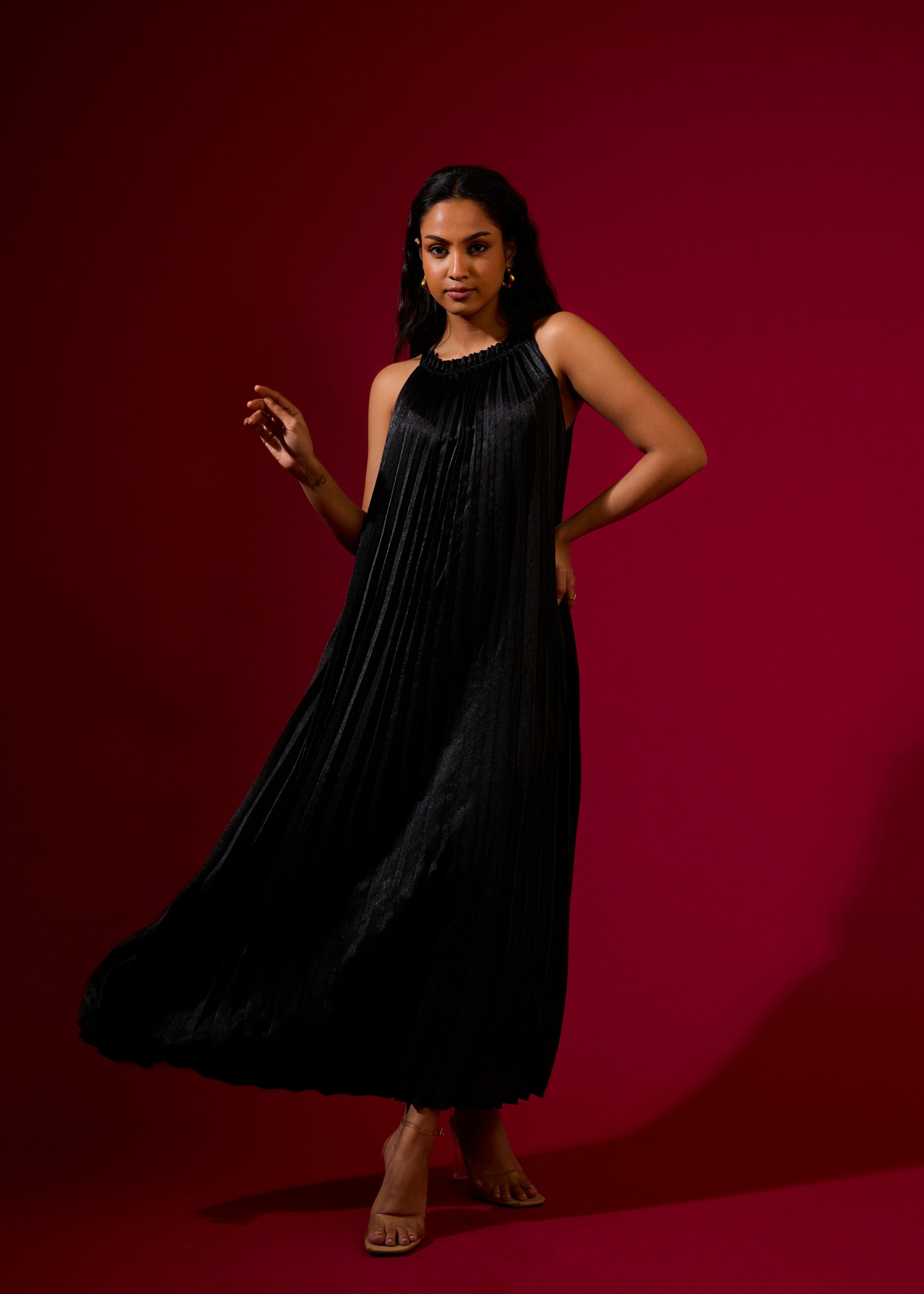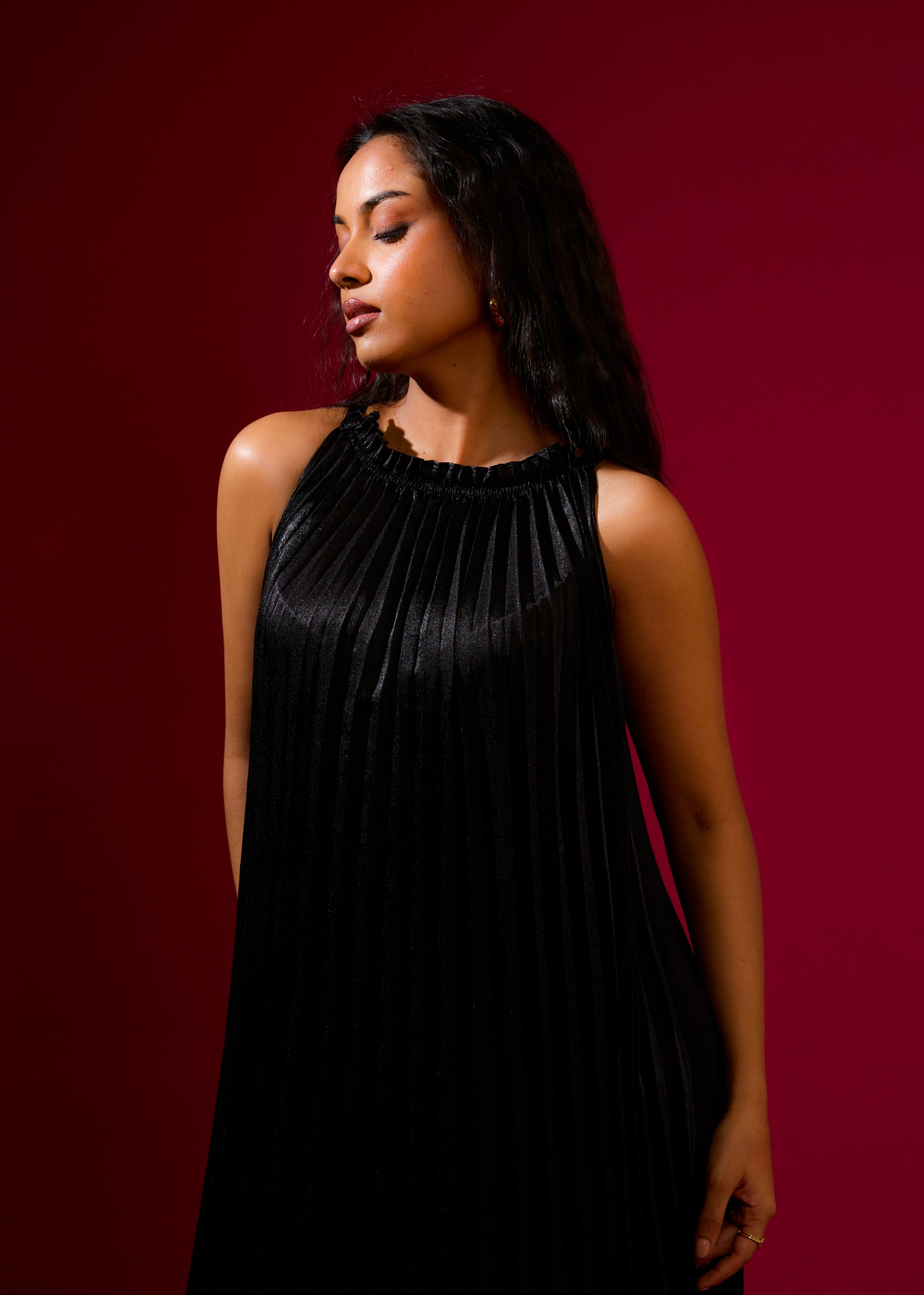 Featuring the gorgeous black metallic slip dress with pleats & high neck. (Fits from S to XL)