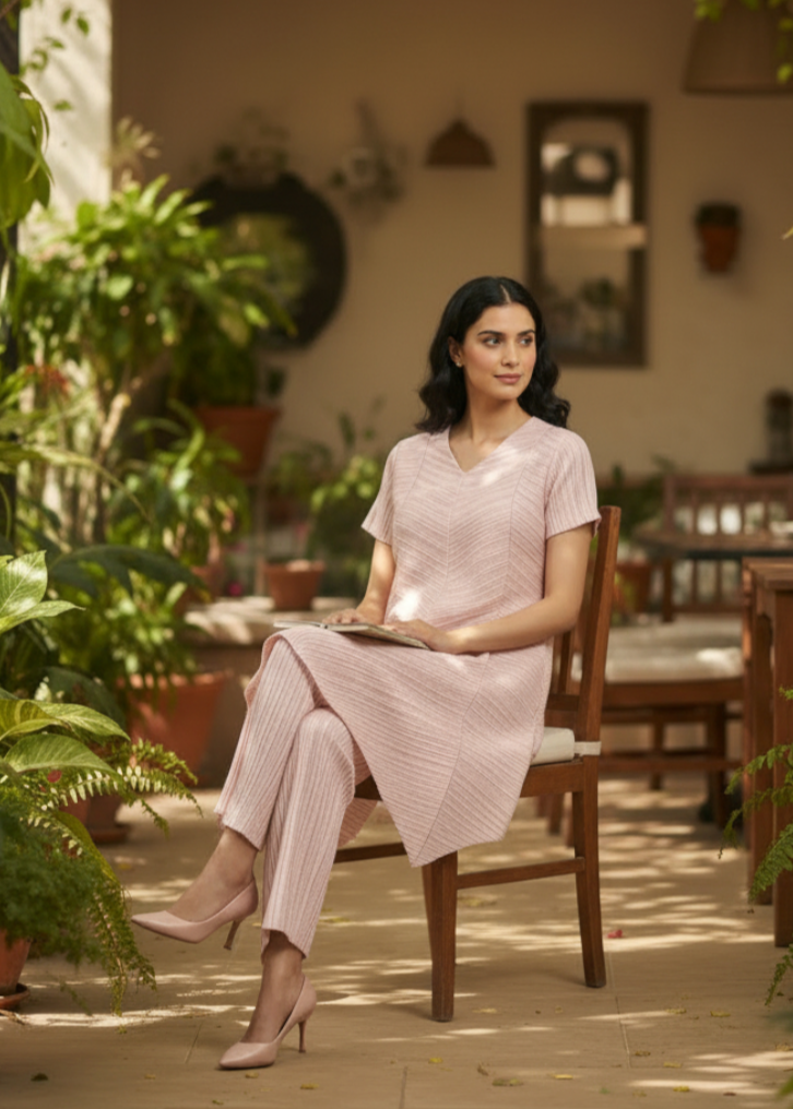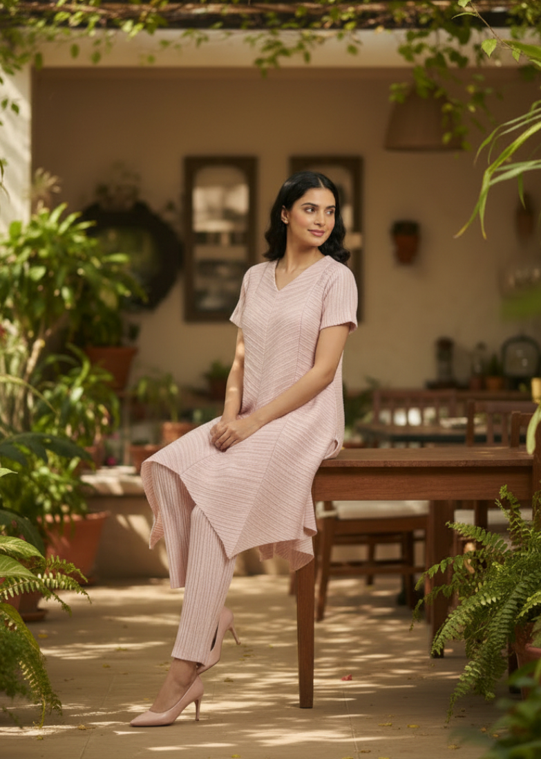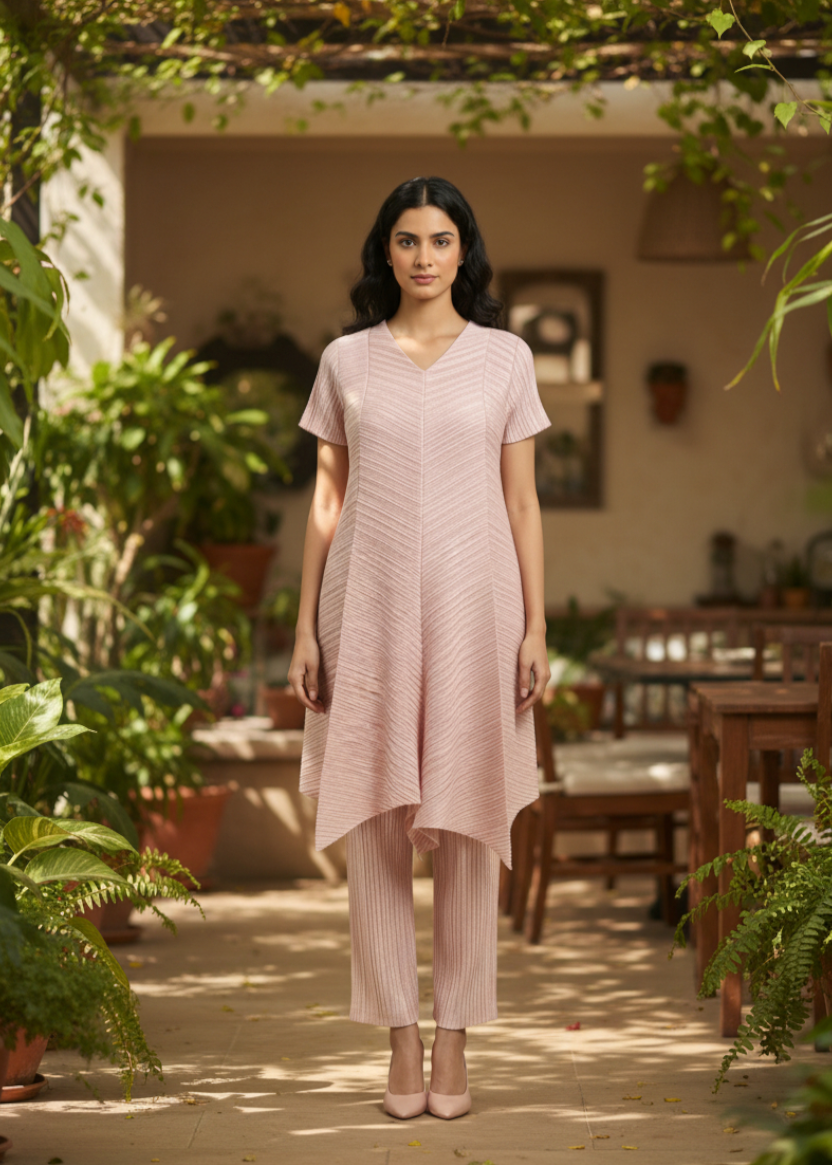 This rose gold coord set is your ticket to effortless chic—an elegant pleated tunic with an asymmetrical edge meets tailored straight trousers for a look that's both fun and polished. (Fits from S to XXL)