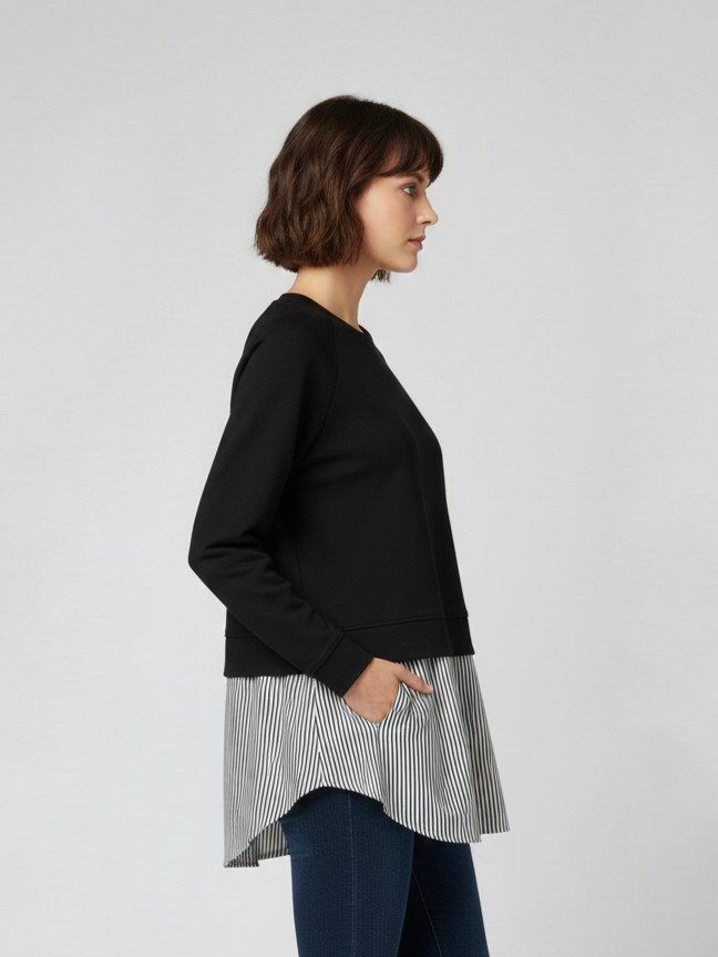 A contemporary color-block shirt combining a solid black body with black pinstripe panels, featuring a round neckline and long sleeves for a clean, modern style.